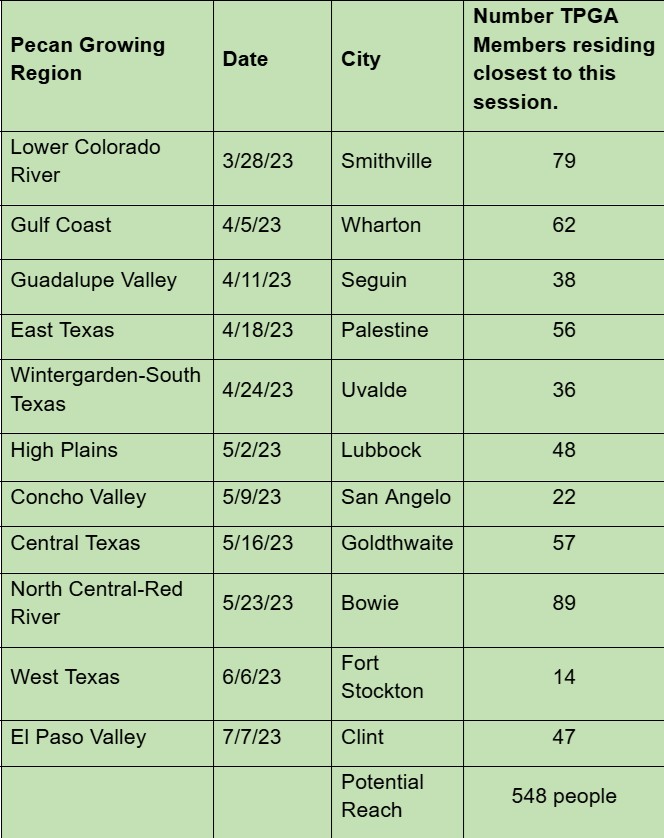 Table 1. Location and grower access to eleven town hall-style pecan listening sessions, 2023. (Graphic provided by Monte Nesbitt)