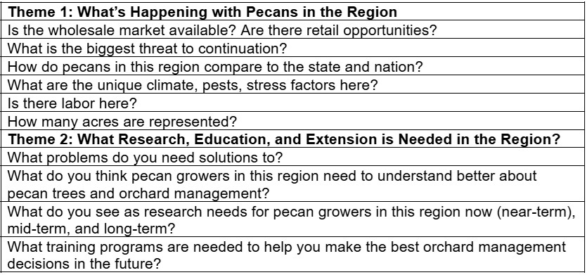 The Texas pecan industry is widely dispersed across a large state. Where to hold listening sessions and how to communicate them to growers posed a challenge. A combination of the TPGA membership list, Pecan South subscriber list, and pecan growers identified by Texas County AgriLife Extension offices were used to locate host sites for eleven town hall meetings, conducted April to July 2023 (Table 1). County Extension offices and TPGA social media and newsletters communicated the dates and locations. The discussions were intended to be open, candid, and naturalistic conversations, with university and TPGA personnel as listeners and pecan growers/marketers as talkers. Two sets of guiding question themes were used to direct the discussion (Table 2).