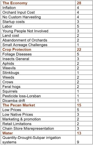 Table 3. Problem themes manifested from Texas pecan growers participating in eleven town hall listening sessions, 2023.(Graphic provided by Monte Nesbitt)